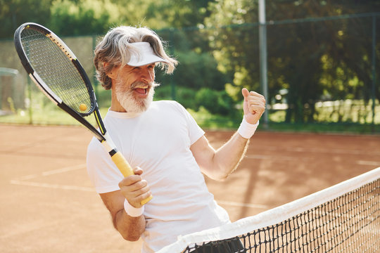 Senior man relaxing at outdoor tennis court holding racquet