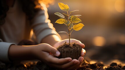 Child's hand holding small tree with sunset rays