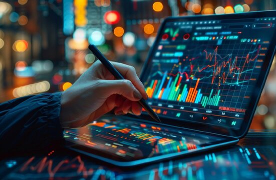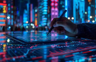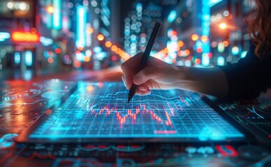 people uses wan tablet to draw and write on digital charts on dark background. woman hand holding the stylus pen against the tablet screen.