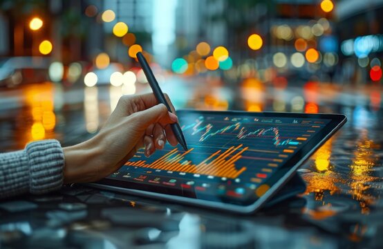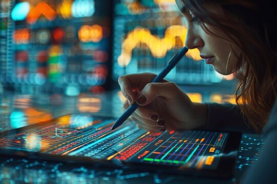 Young  woman uses wan tablet to draw and write on digital charts on dark background. woman hand holding the stylus pen against the tablet screen.