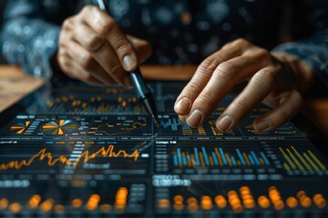 man uses wan tablet to draw and write on digital charts on dark background. woman hand holding the stylus pen against the tablet screen.