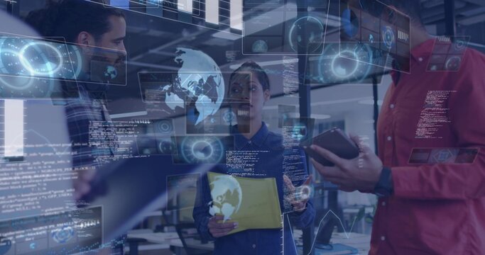Holding Tablet While Collaborating With Team Using Holographic Data Visualization Images