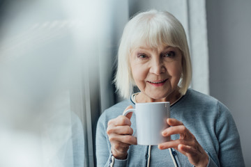 smiling senior woman holding cup of coffee at home and looking at camera