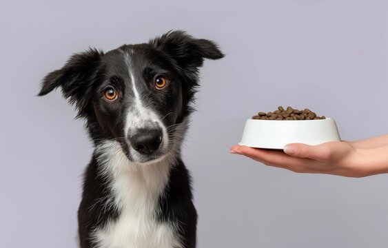 A hand holds a bowl filled with dog food balls while a curious dog eagerly looks on, highlighting the bond between pets and their owners