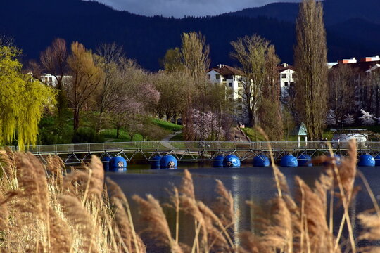Landscape with traditional dutch windmills and path near the water canals. Clouds at colorful sunset in spring. Kinderdijk, Netherlands. Holland