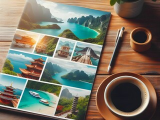 Family photo archive placed in a mini photobook. Photobook with travel and summer holiday memories close up. Digital photography gallery in print album with hardcover (hard cover) and blank copy space