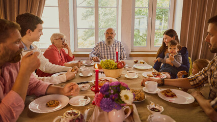 Multi-generational family gathering around table with food and candles. Concept of generational bond, cultural traditions, warm atmosphere, holiday campaigns, and family care.