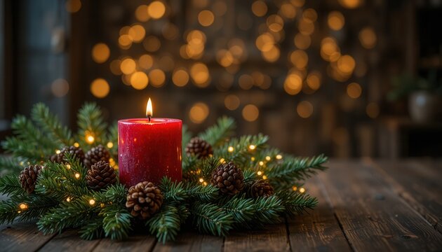 Red candle in pine arrangement with lights brightening dark background during winter season
