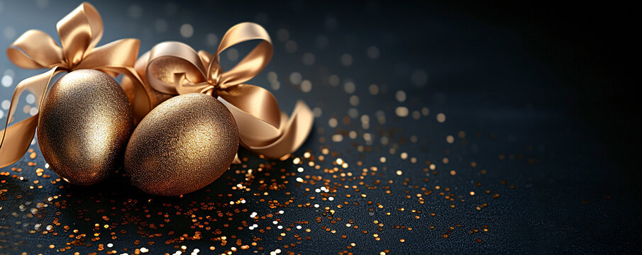 Easter eggs with gold decor and silk ribbons on a dark plain background. Banner, card with place for text. Free space for copying. Religious holidays concept