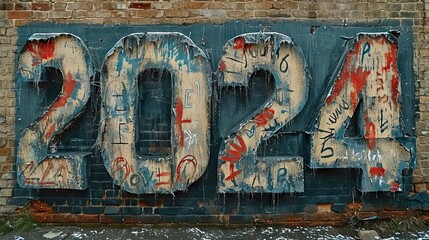 Inscription 2024 on an old brick wall, painted with graffiti.