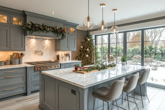 Interior of kitchen with modern furniture and beautiful Christmas decor