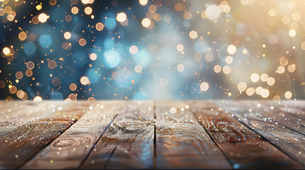 Christmas holiday background with empty wooden deck table over winter bokeh. Ready for product montage
