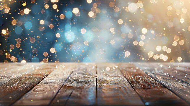 Glittering Christmas holiday background with empty wooden table in front : Generative AI