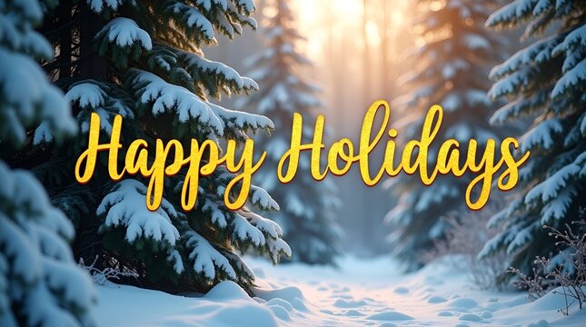 Rustic Christmas scene with Happy Holidays script text over frosted evergreen trees, snowy woods background, cozy winter holiday design