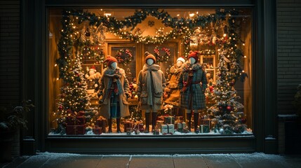 A holiday store window showcases elegant mannequins dressed in warm winter attire, accentuated by twinkling lights, festive decorations, and colorful gifts