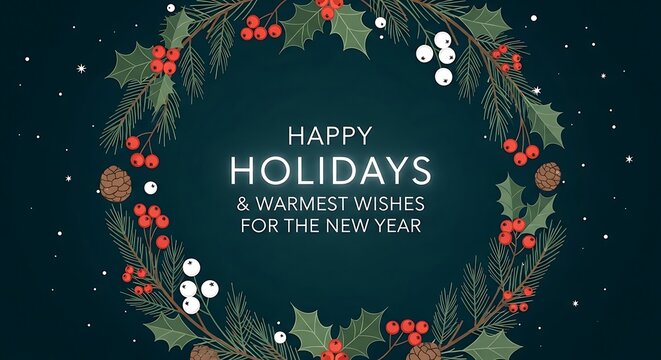 Elegant happy holidays greeting card featuring a symmetrical arrangement of red berries and green leaves with subtle sparkle accents