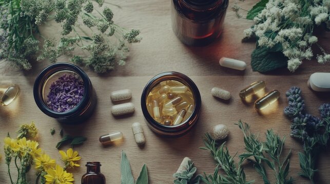 Natural healthcare concept with supplements and fresh mint