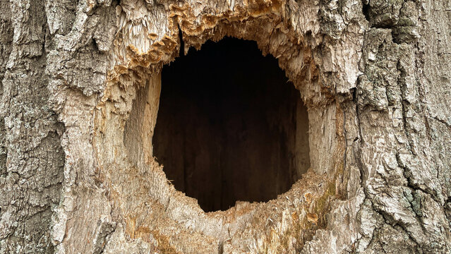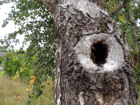 bird hollow in a tree close-up. Bird house, bark of tree with a hollow, invoice, texture