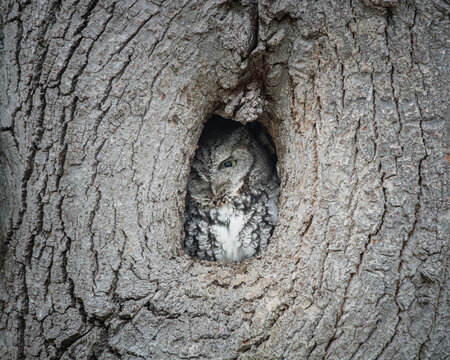Wise Tree Owl A wise owl nestled in the hollow of a large tree i