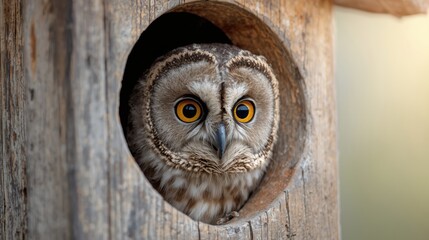 Close-up of a tawny owl peeking out from a tree hollow, surrounded by rough textured bark.