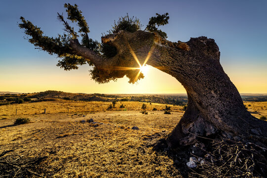 Majestic holm oak trees at sunset creating a magical atmosphere in the countryside