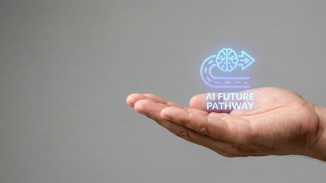 Generative ai high technology concept with hologram brain icon and level planning pathway glowing above open human hand on grey background