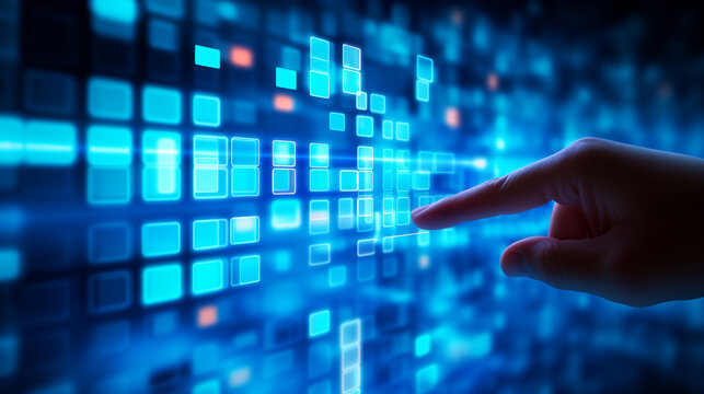 A person's hand is touching and pointing at a floating hologram screen that made of digital blocks