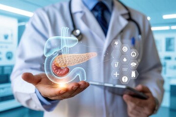 Doctor holding a holographic projection of the human pancreas with medical icons representing health and treatment options