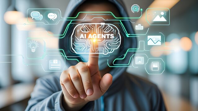 Person interacting with a futuristic ai agents interface displaying brain and icons