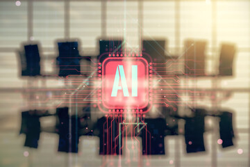 Creative artificial Intelligence symbol hologram on a modern coworking room background. Double exposure
