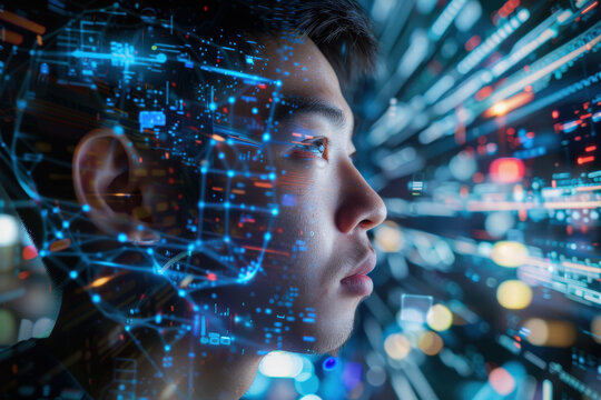 Futuristic Technology Vision: Portrait of Young Person with Digital Overlay