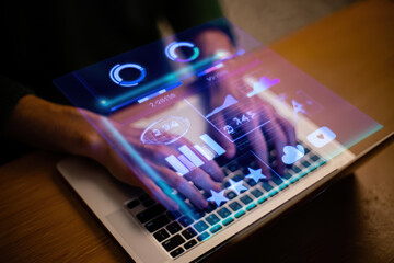 Person using laptop with holographic display showing charts and data visualizations overlaying the screen