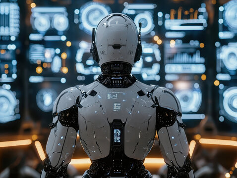 Futuristic AI control center features humanoid operator amidst vibrant holograms displaying critical data in a high-tech environment