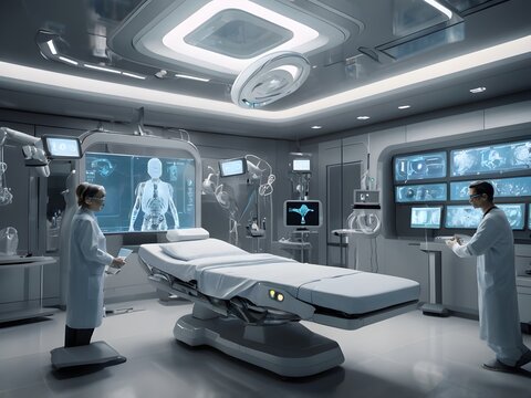 Futuristic hospital room with holographic patient data display. Advanced medical technology, digital health monitoring, and virtual diagnostics in modern healthcare setting