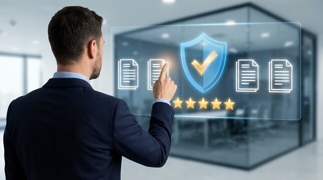 Businessman holding a holographic document with a verified checkmark signifying approval and successful completion of tasks