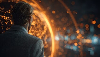 A woman gazes at a glowing, holographic representation of Earth, set against a backdrop of abstract light effects