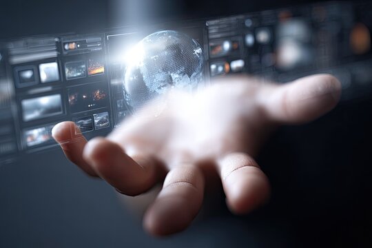 Hand interacting with a holographic globe and digital interface