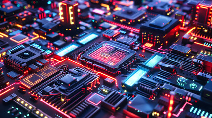 Futuristic city skyline with glowing holographic computer chip amidst circuit boards, showcasing the synergy of artificial intelligence and urban life