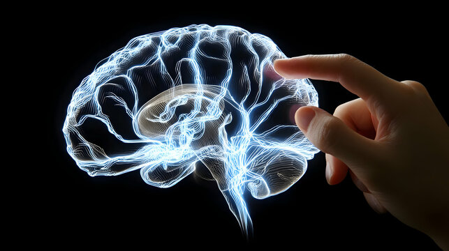 reaching out to a holographic light bulb among abstract tech elements