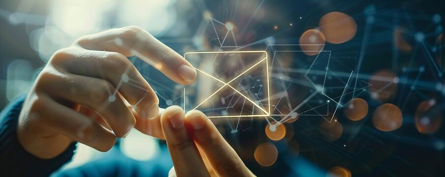 Digital hand holding glowing holographic envelope with vibrant light trails and futuristic elements