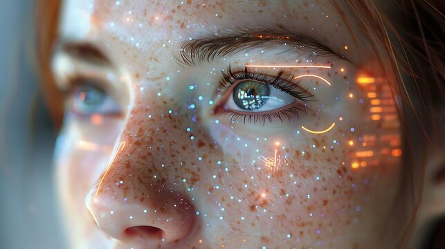 Showcasing adult woman's face and eyes in abstract backdrop, with translucent network overlay
