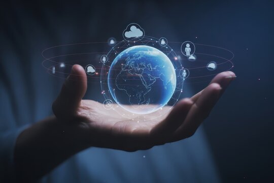 Holographic earth globe in a hand, displaying global connections.