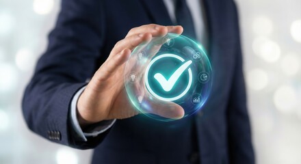 Professional adult man in a suit holding a glowing digital checkmark hologram indoors, representing quality assurance, success, and business technology in a modern office setting.