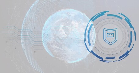 Displaying holographic Earth globe projecting circuit-like lines in cyberspace, with HUD interface