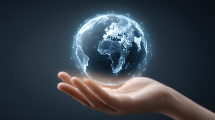 Detailed Glimpse into a Holographic Earth Held Gently in an Outstretched Hand, Showcasing Advanced Technology and Global Connectivity