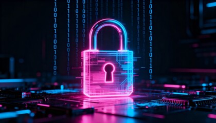 Glowing digital padlock hologram in pink and blue neon, cyber security concept, dark futuristic background with binary code