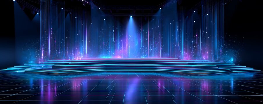 Virtual concert stage mockup with holographic speakers and neon floor grid