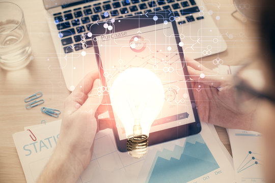 Double exposure of man's hands holding and using a digital device and bulb hologram drawing. Idea concept.