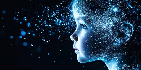 A child's face, half in shadow, half illuminated by the soft glow of a holographic display. Their eyes are wide with wonder,