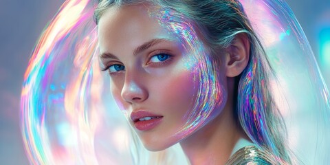 Portrait of Beautiful young Woman with Colored Glasses. Beauty Fashion. Perfect Make-up. Pink Nails Manicured. Colorful Decoration. Holographic sunglasses. Coral color